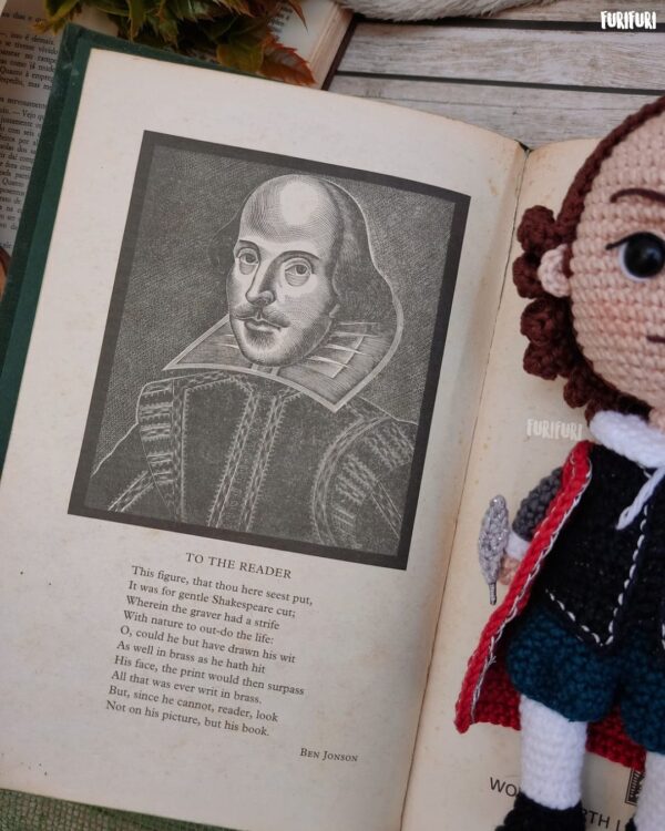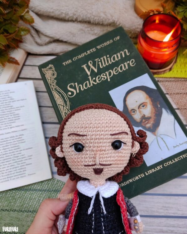 – Arquivo digital que contém instruções detalhadas para a confecção de um amigurumi inspirado no dramaturgo William Shakespeare;